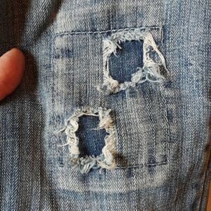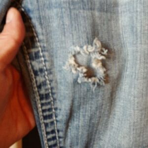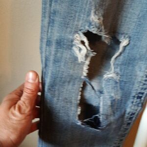 There is a huge hole in the front left pocket. These are distressed style, as shown. Junior girls size 7. Make an offer!