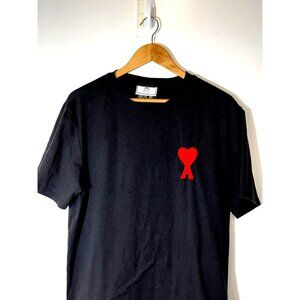 A minimalist black t-shirt featuring Ami's iconic red heart-shaped logo, crafted with understated elegance and contemporary design.