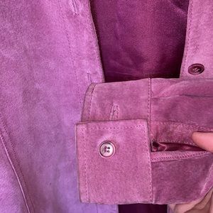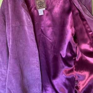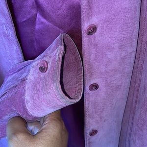 100% Leather beautiful stitching like a Western button up no scratches or stains has a beautiful purple satin lining. Super easy to dress up or dress down. Could use professional cleaning see pictures of cuffs and collar. From Smoke and Pet Free Home. Offers and Questions Welcome.