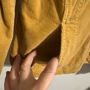 Chic yellow mustard corduroy jean jacket by Ami. Ideal for everyday wear. Features button closure and timeless style.