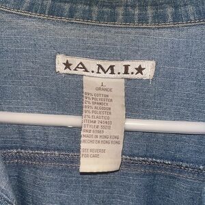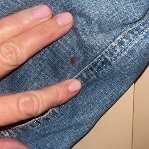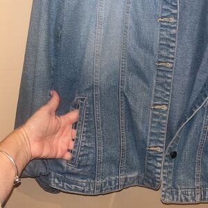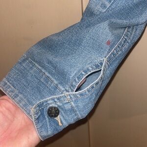 Has a few red spots, probably paint, barely noticeable and priced with that in mind. Final sale. Great over sized jacket, button sleeves. Pit to pit measurement is 23 1/2” inches same for shoulder to hem. Sleeve is 24” inches