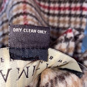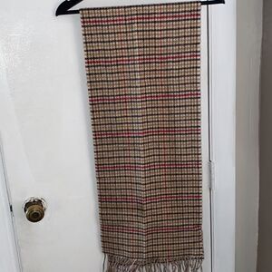 Tan with red, black, and gold plaid pattern, raw hem, fringe ends. 100% Lambswool. Measures 60” x 12” with 3” fringe.
