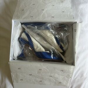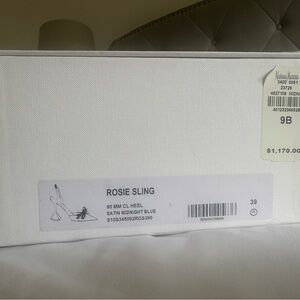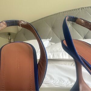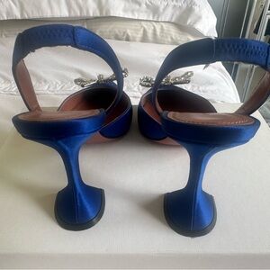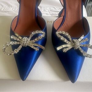 AMINA MUADDI ROSIE SLING in MIDNIGHT BLUE SATIN. They don’t make these anymore! Worn once to a wedding, and were half a size too big so not a fit for me. 95MM Heel, satin, Swarovski crystal bow. See pic #5 for internal signs of wear on sling from double sided tape.