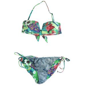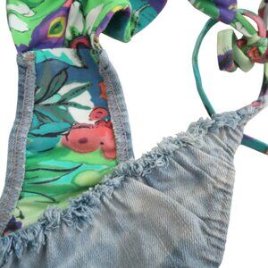 Bottoms have blue tie dye front & floral print back, fringe detail at top edge, and adjustable ties at sides.