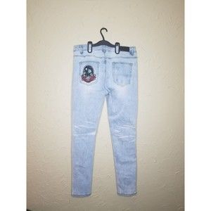 Make a bold fashion statement with these AMIRI Thrasher Skinny-Fit Appliquéd Distressed Denim Jeans in Blue. Designed for men with a sense of style, these jeans feature a unique distressed look that is sure to turn heads. The skinny fit is perfect for those who want to show off their physique, while the denim fabric ensures durability and comfort. The size 34/32 fits regular-sized men comfortably, and the jeans come with tags for authenticity.