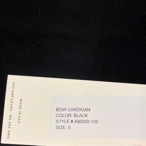 AMO black bow cardigan size small. Snap closure, v-neck neckline, long sleeves. Brand new never worn with tags. Made from 100% cotton.