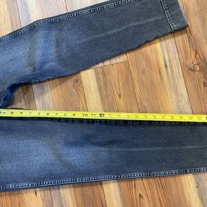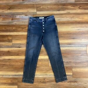Stylish dark blue jeans. Features button fly. Perfect for casual wear.