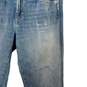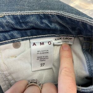AMO Kick Crop Jeans in Sweet Cheeks. Style A01214-005. Made in USA. Whiskering on front along pockets. Destroyed fabric detail throughout. Frayed step hem.