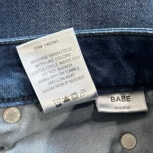 The BABE high-rise jean is fitted through the waist, hips and thighs. Leg is cropped just above the ankle and fits slim from knee to hem. Features button fly, 5-pocket styling and undone hem.