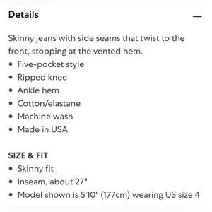 AMO Twist Ripped Skinny Ankle Jeans Size 26