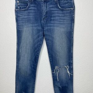 Cotton blend. Slight whiskering and fading along front. Intentionally destroyed areas.