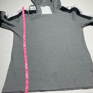 Features: Waffle knit texture, Hood with drawstring eyelets, Black and white stripes on shoulders/upper arms, White patch detail near neckline