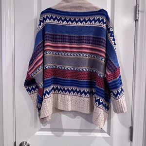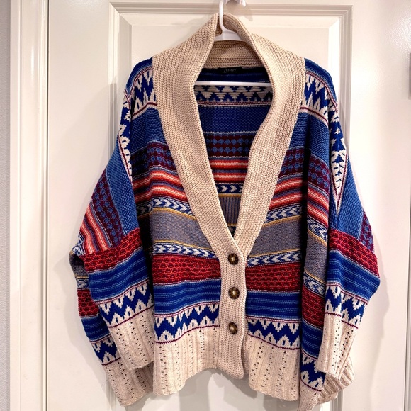 AMOR COLLECTION BOHO COVER-UP SWEATER BOHEMIAN RETRO - EARTH TONES - Beige, Brown, Rust, Orange & Blue. With Brown Lacquer Buttons. Super Comfortable in Excellent Mint and clean condition.