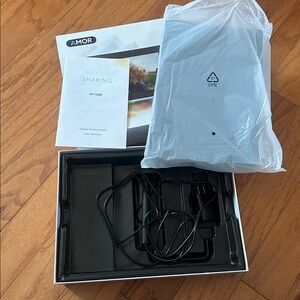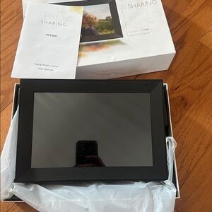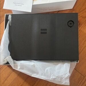 AMOR digital photo frame with a sleek black design. Perfect for displaying cherished memories. 10.1” screen. Tried to use in an assisted living facility, but WiFi wouldn’t allow. The box did get coffee spilled on it, but the frame or plug wasn’t in it when happened. Never used. Smoke and pet free home.