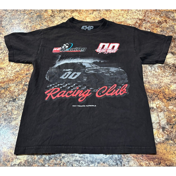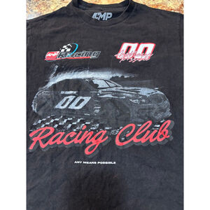 Black AMP Racing Club graphic t-shirt featuring bold racing graphics on the front and a plain back. Medium size, 100% cotton, made in USA. Pre-owned in good condition with light general wear. Perfect for streetwear, motorsport fans, and casual everyday outfits.
