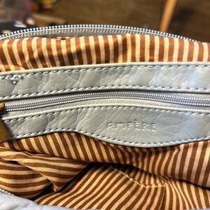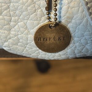AMPERE creations soft vegan leather handbag new with tags. This handbag is very very soft and imperfect condition. There’s two buckles on the front and then when you open the bag, there’s a pocket that goes all the way down into the bag and there’s also on the outside and there’s also a zipper with an opening that is brown and tan striped and it has a zipper inside of that and two places for cell phone. This is absolutely gorgeous and so soft. There’s a zipper on the back as well. This is a shoulder bag. The dimensions are 11 inches long. 12 inches wide each pocket in the front is 5 inches wide and 5 inches long. It comes with a very cute brass colored keychain that says AMPERE.