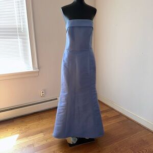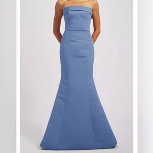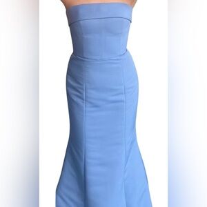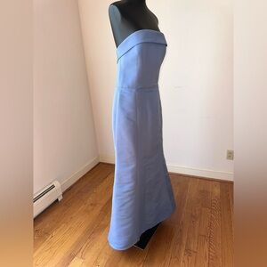 This elegant strapless dress in a stunning blue shade is perfect for any special occasion. Its sleek design offers a sophisticated look.