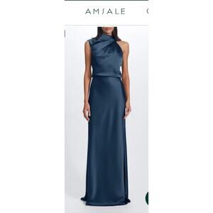 This elegant AMSALE dress is a stunning addition to any wardrobe. The dress features a beautiful French-Blue color and a luxurious satin finish. The draped design and round neck add a touch of sophistication, while the sleeveless cut and ankle-length hem make it perfect for any special occasion.