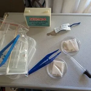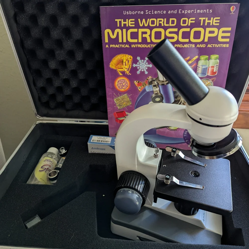 Explore the world with this white and black microscope. Includes a science book for experiments. Also, comes with hard case, test slides, and other gadgets.