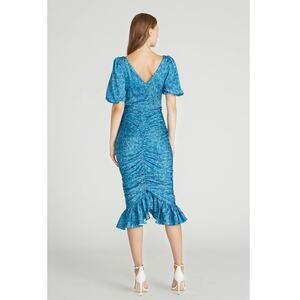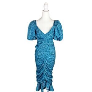 AMUR Alize Blue Charmeuse Ruched Puff Sleeve Midi Dress Size 2 NWOT