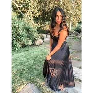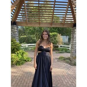 AMUR Black Satin Pleated Bustier Rib Cut-Outs Elodie A-Line Gown Size 4. The AMUR Elodie A-Line Gown combines sleek sophistication with modern allure. Crafted from luxurious black satin, this gown features a pleated bustier design that accentuates the neckline and adds a touch of elegance. The rib cut-outs create a striking yet tasteful detail, while the flattering A-line silhouette flows gracefully for a timeless finish. Perfect for formal occasions or evening events, this gown is a stunning choice that effortlessly blends classic style with contemporary edge.
