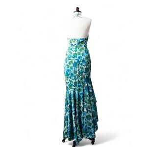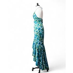 AMUR Blue Floral Halter Gown with Ruffle Detail (Size 8)