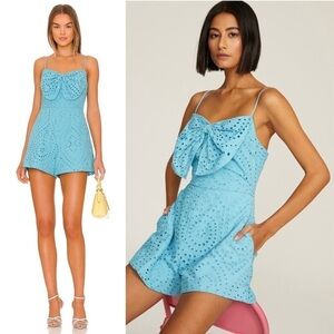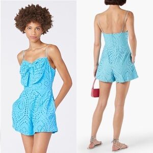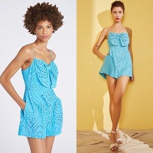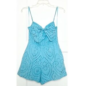 Stunningly crafted in custom eyelet fabric-this playsuit is a stellar piece that makes a bold and beautiful entrance. It features a feminine bow tie accent at the front and is brushed in a refreshing pop of blue giving it a summer forward hue.
