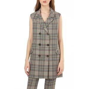 This woven plaid blazer vest is double breasted and has a belt. Wear it closed and belted for a mini dress option, or layer it open over any outfit - perfect for a day at work.