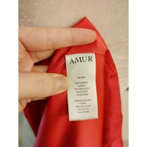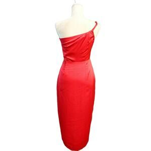 AMUR Deena one shoulder dress in Raspberry hot pink satin. Twisted strap & cebter with side cut-out. Silky satin made from 100% recycled polyester. Wrap style skirt thats slightly longer in the back. Side zip closure. Small unnoticeable pull at front (shown in pic) that you cannot see when worn at all especially since it folds into where fabric gathers.