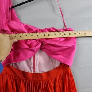 Features a striking color block design: bold pink ruffled one shoulder bodice with pleated vibrant orange maxi skirt. Asymmetric neckline with one ruffled shoulder and one thin spaghetti strap. Fully lined interior for smooth comfort. Side zipper closure for easy dressing.