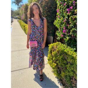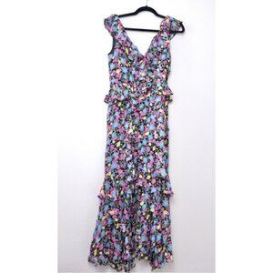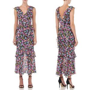 AMUR Evita Silk Floral Ruffle Midi Dress 8 Sleeveless Vneck Slit Chiffon