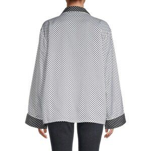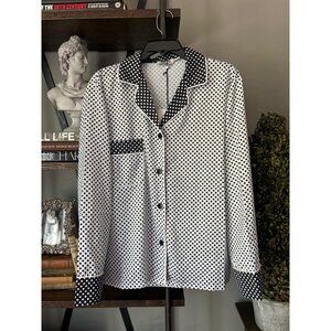tags: designer, blouse, shirt, top, polka dots, monochrome, monochromatic, pajama top, party, cocktail, night out, silky