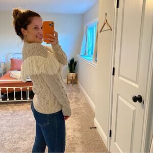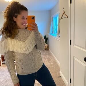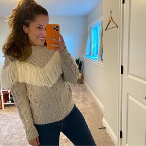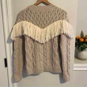 AMUR Gray Cream Cable Knit Soft Wool Fringe Sweater Small