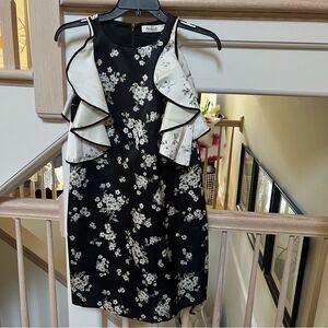 Cherry blossom printed duchess satin fabric. Cold shoulder cutout with contrast colored ruffle sleeves. Sheath silhouette and fully lined. Hidden back zipper and hook closures. A standout dress perfect for special occasions.