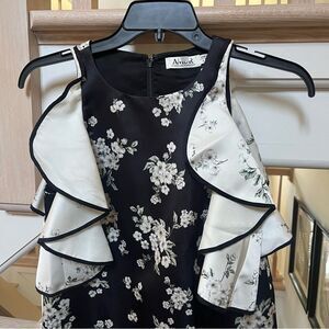 AMUR Jennifer Cold Shoulder Mini Dress in Black White Cherry Blossom Print 2 NWOT