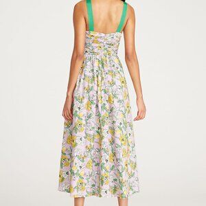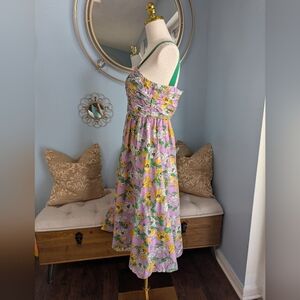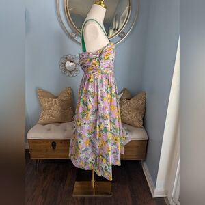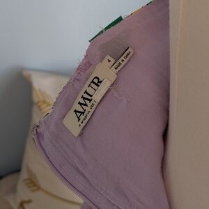 This elegant AMUR sundress features a sleeveless halter neckline. The dress showcases a vibrant blend of purple and green hues, crafted in a light, airy fabric ideal for warm weather occasions.