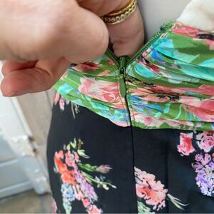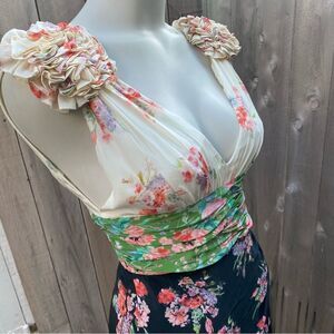Features - Embellished floral details at its shoulder, ruffled hem, midi, V-neck, sleeveless, banded waist, concealed back zip closure, lined // 100% silk Lining: 100% cupro