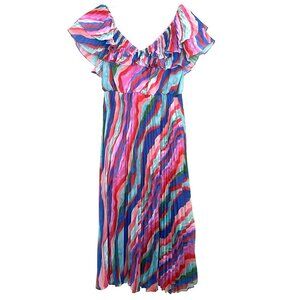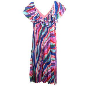 AMUR Luisa Pleated Midi Dress 8 Multi-color Aventurine Marble V-neck Ruffle