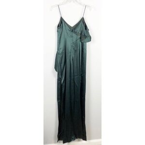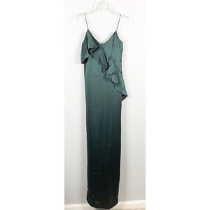 Features maxi/long length, ruffle detail, spaghetti straps, interior lining. Satin finish. 100% silk, Dry clean only. Green. Revolve, evening, formal, event, party, bridesmaid, date, wedding guest, cocktail, holiday, party, Christmas.