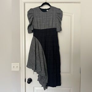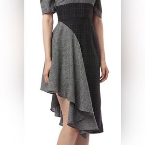 This below the knee woven plaid Uma Dress has colorblocking detailing and finishes with an asymmetrical ruffle at the skirt.