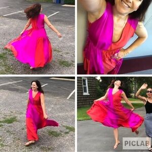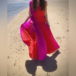 Pink and orange silk (100% Silk). Maxi. Sleeveless. V-neckline. 54.5" from shoulder to hemline. Imported.