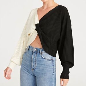 AMUR Cruz Twist Sweater - Black & Cream Off Shoulder 100% Merino Wool NWT Medium
