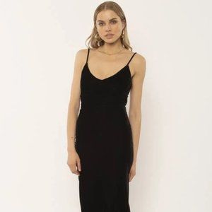 Velvet tie back dress from Revolve (sold out). Fully lined, midi length with fully adjustable straps that can be worn crossed in the back or straight down like a tank top. Shell is 95% polyester and 5% spandex with 100% viscose lining.