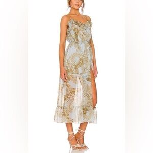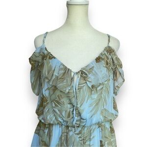 Amuse Society Midsummer Floral Maxi Dress in Sea Wind Size Large. Midsummer is a float sleeveless maxi dress in painterly palms printed poly crinkle chiffon with flirty ruffle along the neckline. She has delicate straps and encased elastic waist with a high slit over the left leg. The dress is lined and the hem and ruffle is finished with a picot edge.