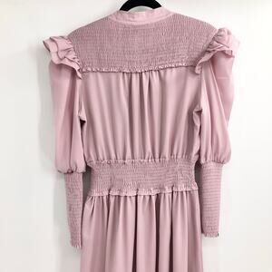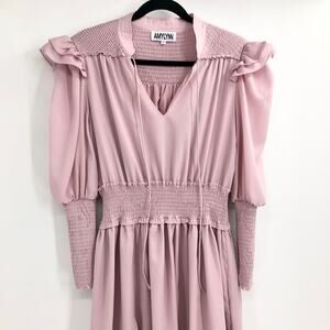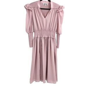 AMYLYNN Maeve Pink Smocked Long Sleeve Frill Shoulders Midi Dress Split Neck S