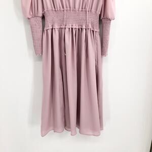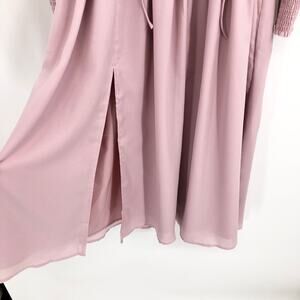 Size small AMY LYNN dress in a pink-purple-mauve color with smocking at the neck, cuffs and waist. High front slit. Partially lined.
