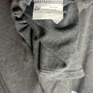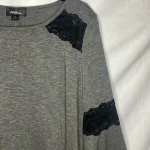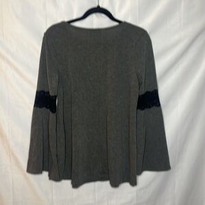 STYLE: Grey sweater with black lace details and flowy bell 3/4 sleeves, soft fabric, scoop neck