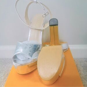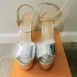 🩶 CHIC Amazon Silver Platforms With Gold Heel Accent. These stylish heels are sexy and comfortable.