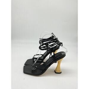 A'Mmonde Atelier 'Anastassia' Black Leather 100 Ankle Tie Heel Size 8 US / EU 38: faux leather upper with manmade sole, imported, ankle wrap with tie closure, lightly cushioned insole, gold-tone hourglass heel, angled square toe.