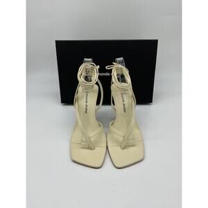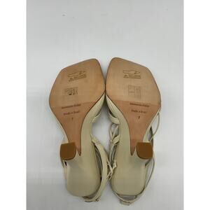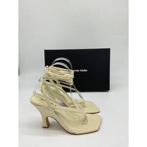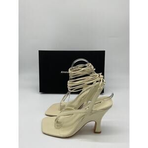 A'Mmonde 'Atelier' White Leather Aza 100 Wedge Size 7: leather upper and sole, made in brazil, ankle wrap tie closure, strappy design.